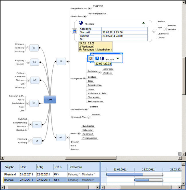 Den einzelnen Zweigen kann man nun Ressourcen und Termine zuordnen, den Projektverlauf dokumentieren und in der integrierten Gantt-Ansicht eine grafische Übersicht über den Stand des Projektes sehen.
